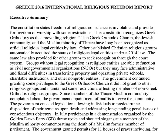 Der Bericht der USA 2016 über die Religionsfreiheiten in Griechenland
