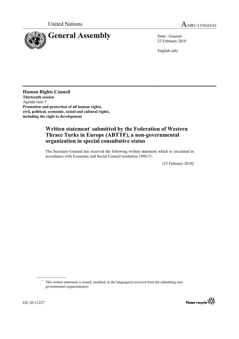 Avrupa Batı Trakya Türk Federasyonu’nun (ABTTF) 23 Şubat 2010 tarihinde Birleşmiş Milletler İnsan Hakları Konseyi 13. Oturumu’na sunduğu “Yunanistan’da İfade ve Medya Özgürlüğü Sorunu” başlıklı yazılı bildiri yayımlandı. Yazılı bildiride Ulusal Televizyon ve Radyo Kurulu’nun (ESR) Yunanistan’da 3592/2007 sayı ve tarihli “Medya Kuruluşlarının Temerküz ve Lisans Alımı ve Diğer Hükümler” yasa gerekçe gösterilerek Tele Radio FM ile ilgili kararının ifade ve medya özgürlüğüne aykırı olduğu ifade ediliyor.