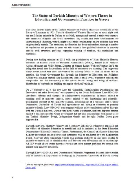 Federation of Western Thrace Turks in Europe (ABTTF) presented a written statement on the re-cent legislation considered to be destroying the educational autonomy of the Turkish Minority of Western Thrace at the 28. Session of the UN Human Rights Council held at UN House in Geneva during 2-27 March 2015. Having demanded the annulation of this law prepared without any consultation with the minority, ABTTF asked the Greek government to constitute an official dialogue mechanism with the minority.