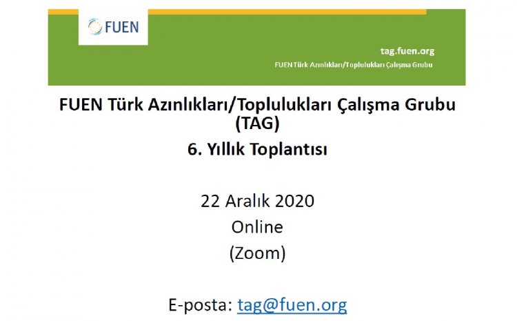 Batı Trakya Türk toplumunu temsilen Avrupa Batı Trakya Türk Federasyonu (ABTTF), Batı Trakya Azınlığı Yüksek Tahsilliler Derneği (BTAYTD) ve Dostluk Eşitlik Barış (DEB) Partisi, 22 Aralık 2020 tarihinde çevrim içi düzenlenen Avrupa Milletleri Federal Birliği (FUEN) Türk Azınlıkları/Toplulukları Çalışma Grubu (TAG) 6. Yıllık Toplantısı’na katıldı.