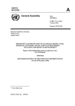 6 Nisan 2009 tarihinde Birleşmiş Milletler Azınlık Sorunları Bağımsız Uzmanı Gay McDougall’ın, 15-16 Aralık 2008 tarihinde gerçekleştirilen Azınlık Sorunları Forumu ile ilgili tavsiyeler raporu nihayet yayımlandı. İnsan Hakları Konseyi’nin kararı ile azınlık sorunlarını tartışmak üzere ilk kez düzenlenen Forum’un teması “Azınlıklar ve Eğitim Hakkı” olarak belirlenmiş olması dolayısıyla Gay McDougall’ın tavsiyeler raporunun konusu yine eğitim oldu.