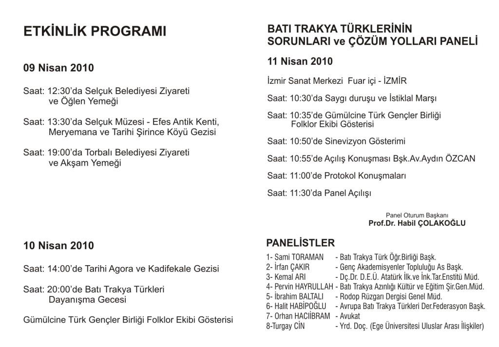 Batı Trakya Türkleri Dayanışma Derneği İzmir Şubesi, 11 Nisan 2010 tarihinde İzmir’de „Batı Trakya Türklerinin Sorunları ve Çözüm Yolları“ konulu bir panel düzenliyor. Oturum başkanlığını Prof. Dr. Habil Çolakoğlu’nun yapacağı panele Avrupa Batı Trakya Türk Federasyonu Başkanı Halit Habipoğlu, Batı Trakya Türk Öğretmenler Birliği Başkanı Sami Toraman, Genç Akademisyenler Topluluğu Başkanı İrfan Çakır, Dokuz Eylül Üniversitesi Atatürk İlkeleri ve İnkılap Tarihi Enstitüsü Müdürü Kemal Arı, Batı Trakya Türk Azınlığı Kültür ve Eğitim Şirketi Genel Müdürü Pervin Hayrullah, Rodop Rüzgarı Dergisi Genel Müdürü İbrahim Baltalı, Avukat Orhan Hacıibram ve Ege Üniversitesi Uluslararası İlişkiler Bölümü Öğretim Üyesi Yrd. Doç. Dr. Turgay Cin konuşmacı olarak katılacaklar.