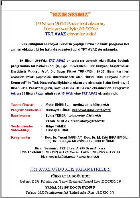 19 Nisan 2010’da TRT AVAZ ekranlarına gelecek olan Bizim Sesimiz programının bu haftaki konuğu, Ege Üniversitesi Türk Dünyası Araştırmaları Enstitüsü Müdürü Prof. Dr. Sayın Fikret TÜRKMEN. 19-25 Nisan tarihleri arasında İzmir Çeşme’de düzenlenecek olan “İkinci Türk Dünyası Kültür Kongresi” ile Türk Dünyası’na ilişkin konuların ele alınacağı Bizim Sesimiz, 19 Nisan 2010 Pazartesi günü, saat 20.00’da TRT AVAZ ekranlarında. Programın tekrarı 25 Nisan Pazar günü saat 15.30’da yine TRT AVAZ ekranlarında.
