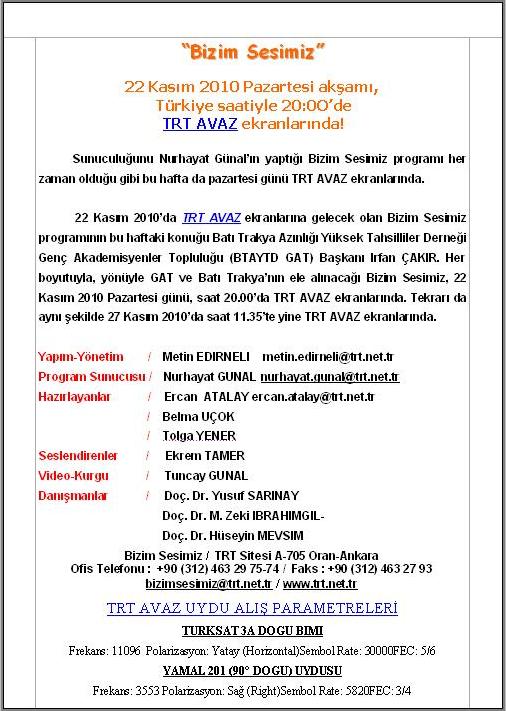 22 Kasım 2010’da TRT AVAZ ekranlarına gelecek olan Bizim Sesimiz programının bu haftaki konuğu Batı Trakya Azınlığı Yüksek Tahsilliler Derneği Genç Akademisyenler Topluluğu (BTAYTD GAT) Başkanı İrfan ÇAKIR. Her boyutuyla, yönüyle GAT ve Batı Trakya’nın ele alınacağı Bizim Sesimiz, 22 Kasım 2010 Pazartesi günü, saat 20.00’da TRT AVAZ ekranlarında. Tekrarı da aynı şekilde 27 Kasım 2010’da saat 11.35’te yine TRT AVAZ ekranlarında.