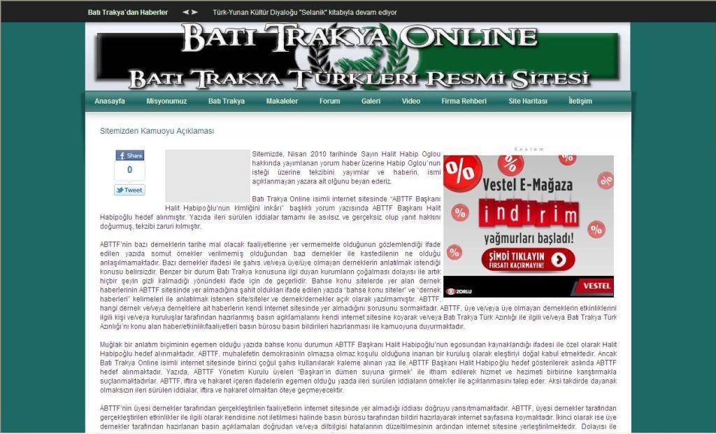 “Batı Trakya Online Site sahibi, Nisan 2010 başında bu internet sayfasında kendisi hakkında bilinmeyen bir yazar tarafından kaleme alınan makaleye Sayın Halit Habip Oglou’nun aşağıda belirtilen tekzibini yayımlar. Site sahibi, hem Nisan 2010 başında yayımlanan makaleye hem de bahse konu tekzibe karşı içerik olarak tarafsız durur.”