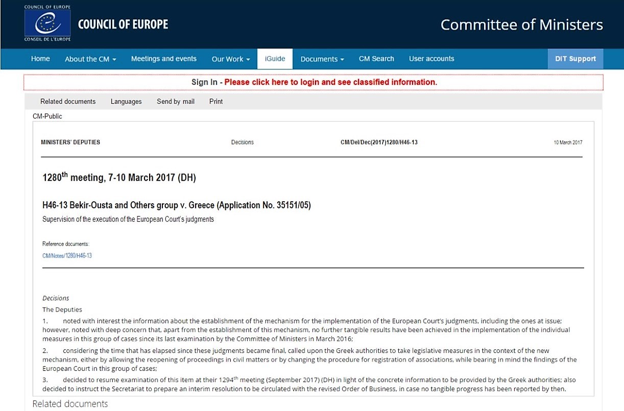 Η Επιτροπή Υπουργών έχει μετά την εφαρμογή των τριών αποφάσεων του ΕΔΑΔ σχετικά με την ελευθερία του συνεταιρίζεσθαι από την Ελλάδα με το όνομα των περιπτώσεων Bekir Ousta και η ομάδα του από το 2008. Λόγω του γεγονότος ότι η Ελλάδα δεν εφαρμόσει τις αποφάσεις επίμονα μια προσωρινή απόφαση έγινε Ιουνίου το 2014 και ΕΔΑΔ ζήτησε από τις ελληνικές αρχές να παρουσιάσει συγκεκριμένο χρονοδιάγραμμα για την εφαρμογή τις αποφάσεις του ΕΔΔΑ.
