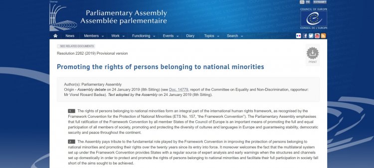 Η Κοινοβουλευτική Συνέλευση του Συμβουλίου της Ευρώπης (Κ.Σ.Σ.Ε) ενέκρινε στις 24 Ιανουαρίου 2019 το ψήφισμα 2262/2019 με τίτλο «Προώθηση τα δικαιώματα των ατόμων που ανήκουν σε εθνικές μειονότητες». Στο ψήφισμα που βασίζεται στην έκθεση που εκπόνησε ο Viorel Riceard Badea (Ρουμανία, EPP / CD), Δεύτερος Αντιπρόεδρος της επιτροπής Κ.Σ.Σ.Ε για την ισότητα και τη μη διάκριση, η Κ.Σ.Σ.Ε επαναλαμβάνει την έκκλησή του προς όλα τα κράτη μέλη του Συμβουλίου της Ευρώπης να ανταποκρίνονται θετικά στις ανάγκες των ατόμων που ανήκουν σε εθνικές μειονότητες και να διαφυλάσσουν τα δικαιώματά τους, ιδίως όπως ορίζεται στη Σύμβαση Πλαίσιο για την Προστασία των Εθνικών Μειονοτήτων (FCNM).
